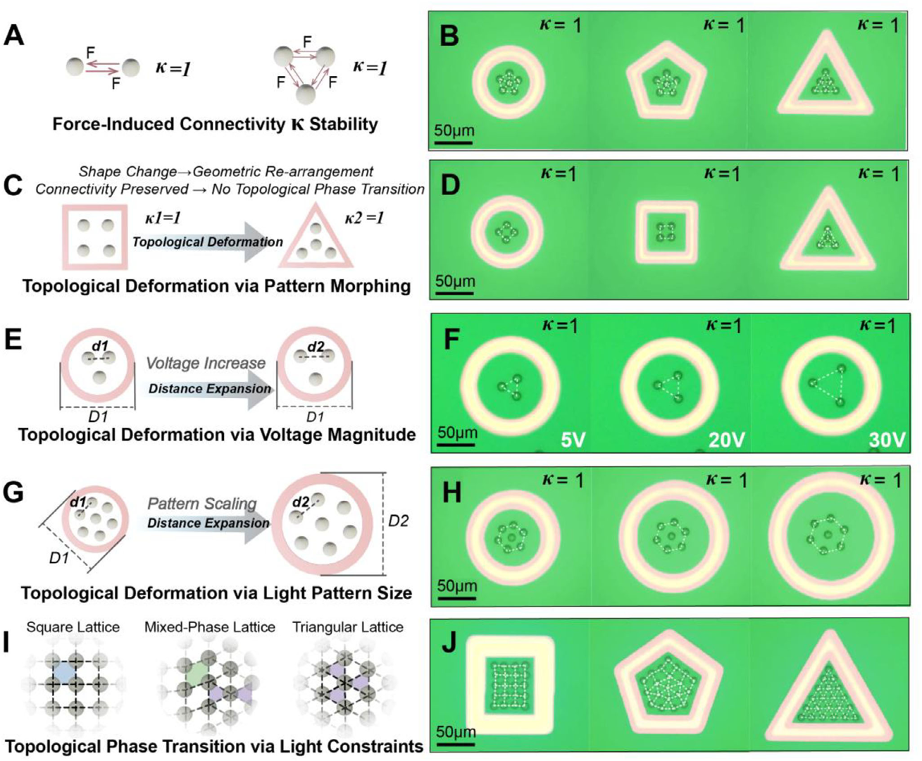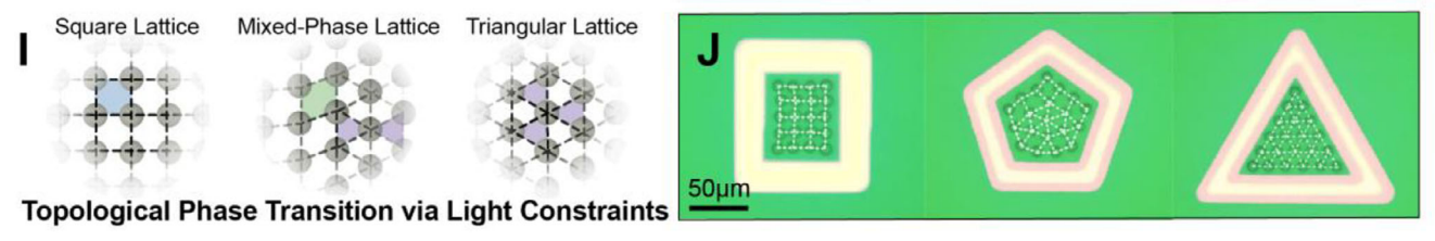 骤变光图案几何形状,可触发拓扑相变(方形晶格→混合相→三角形晶格),实现结构重构,结果见原文图5I-J。
