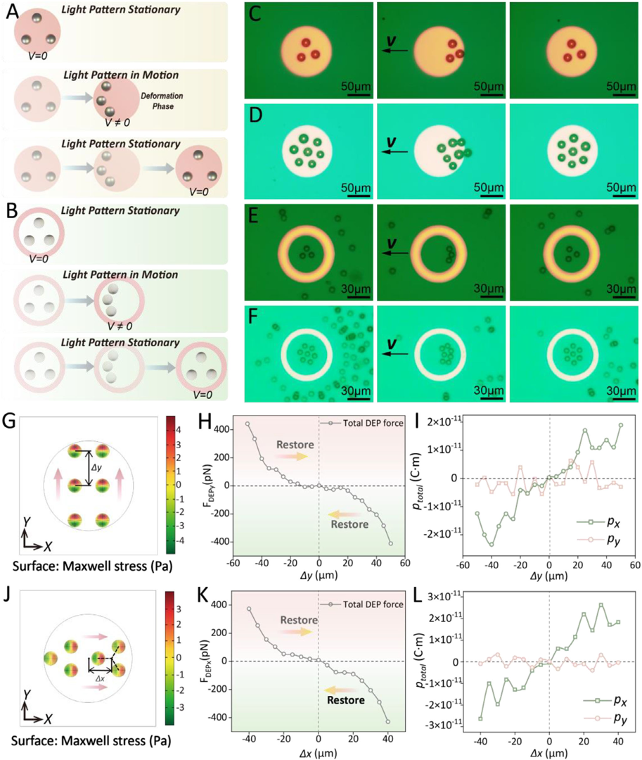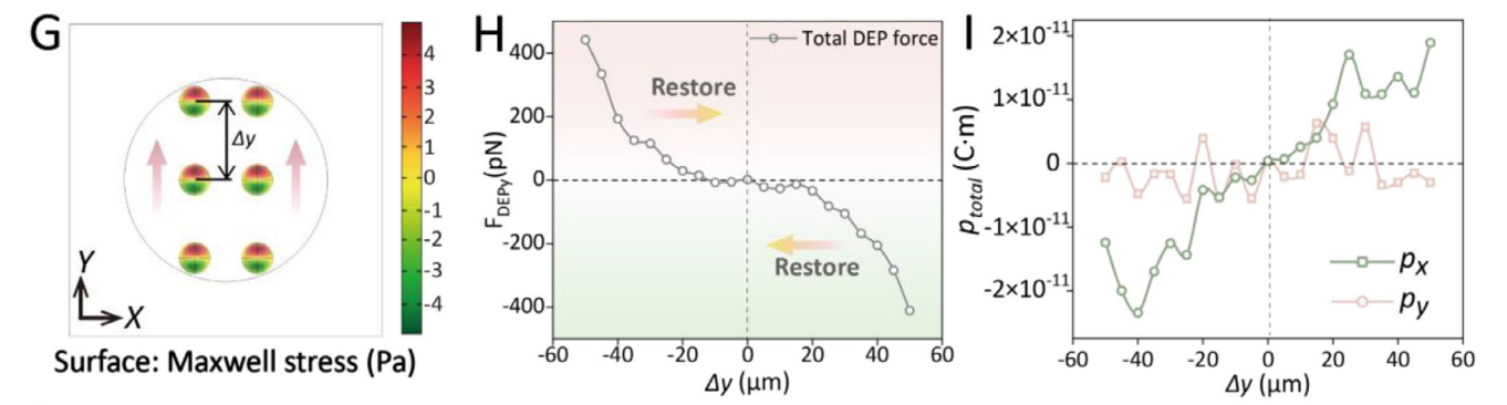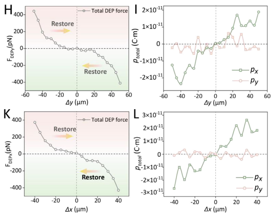 3. 外力扰动破坏平衡时,DEP恢复力会驱动颗粒回归 equilibrium 位置,实现自我修复,机制验证见原文图4G-L。