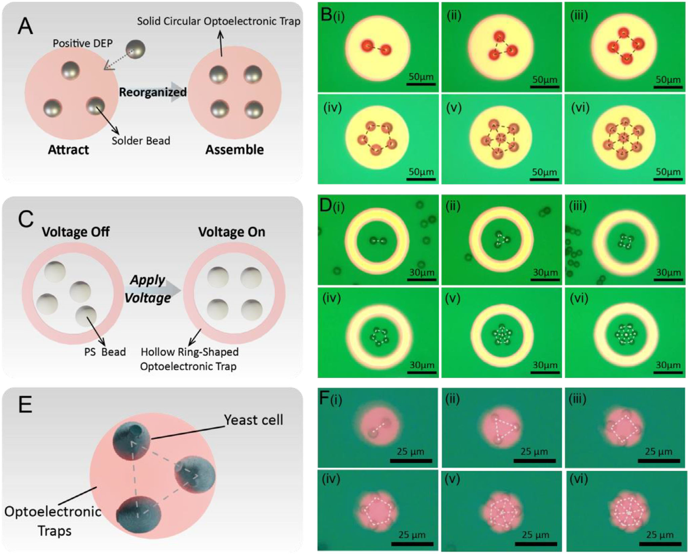 2. 施加特定参数的交流电压(10-30 Vpp,10 kHz-500 kHz),诱导颗粒在光电子陷阱中自组装。