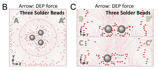 2. 颗粒间存在静电排斥力,与DEP吸引力形成平衡,驱动颗粒自组织为对称拓扑结构,力平衡分布见原文图3B-C。