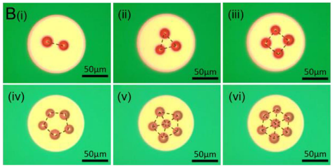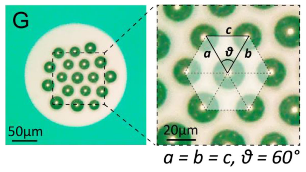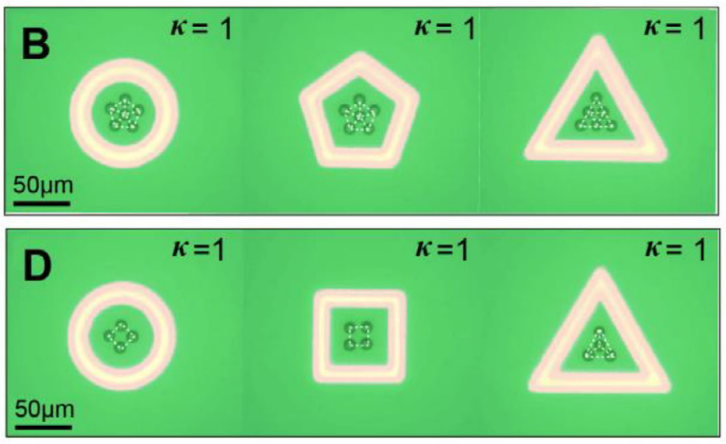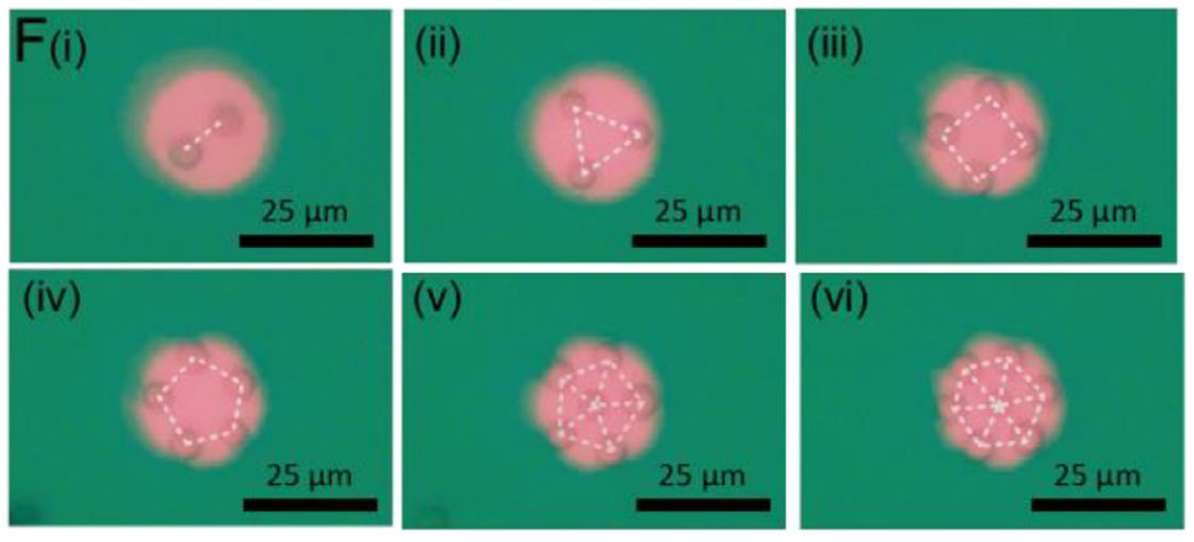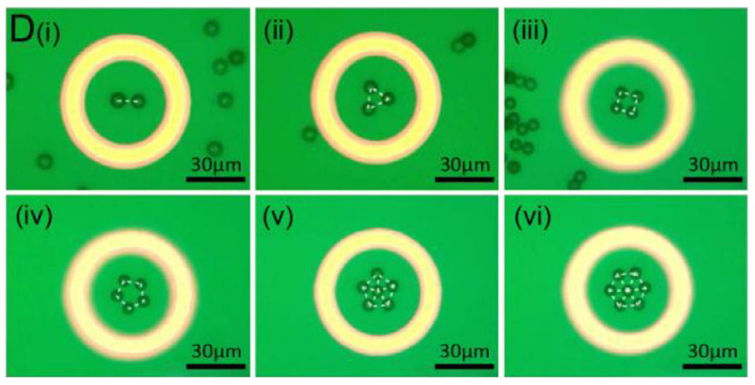 金属微球在圆形光图案中,2-7个颗粒可自发形成三角形、正方形、五边形等对称结构,18个颗粒可形成中心-外围六重对称晶格,结果见原文图2B、3G。