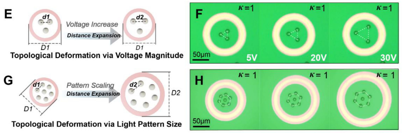 1.拓扑结构 “可编程”:通过调控光图案形状、电压参数,可精准诱导微球形成三角形、正方形、六边形等对称晶格结构,还能实现拓扑变形与相变,相关结构演变见原文图5。