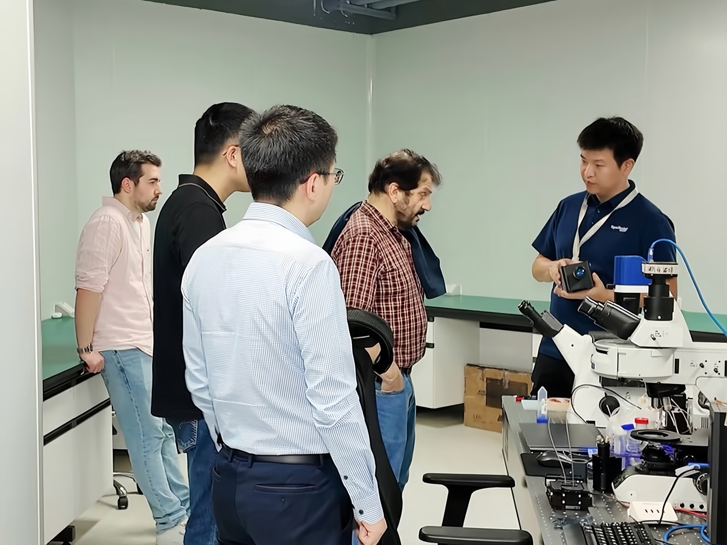 本次David Weitz教授到访,搭建了学术与产业的深度对话机制。双方围绕光电镊在高通量单细胞筛选、细胞精准操控、AI 赋能自动化分析等方向,展开了充分的技术研讨与交流。在参观追光生物研发基地时,David Weitz教授对追光生物自主研发的光流控单细胞分选系统Optobot®系列平台、OptoNeuroBot® 结构光投影仪、DropletBot®数字微流控平台等产品进行详细的了解并与研发人员进行深度的技术交流。此外,David Weitz教授结合自身专业化经验,与追光生物团队深入讨论企业科研战略规划等议题。