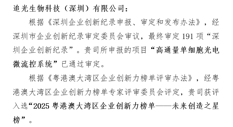 近日,第二十四届“深圳企业创新纪录”审定结果与“2025粤港澳大湾区企业创新力榜单”相继发布,追光生物凭借在高端生命科学仪器领域的突破性创新,一举斩获“深圳企业创新(中国)纪录”荣誉,并成功入选粤港澳大湾区企业创新力榜单,成为生物科技领域自主创新的标杆代表。