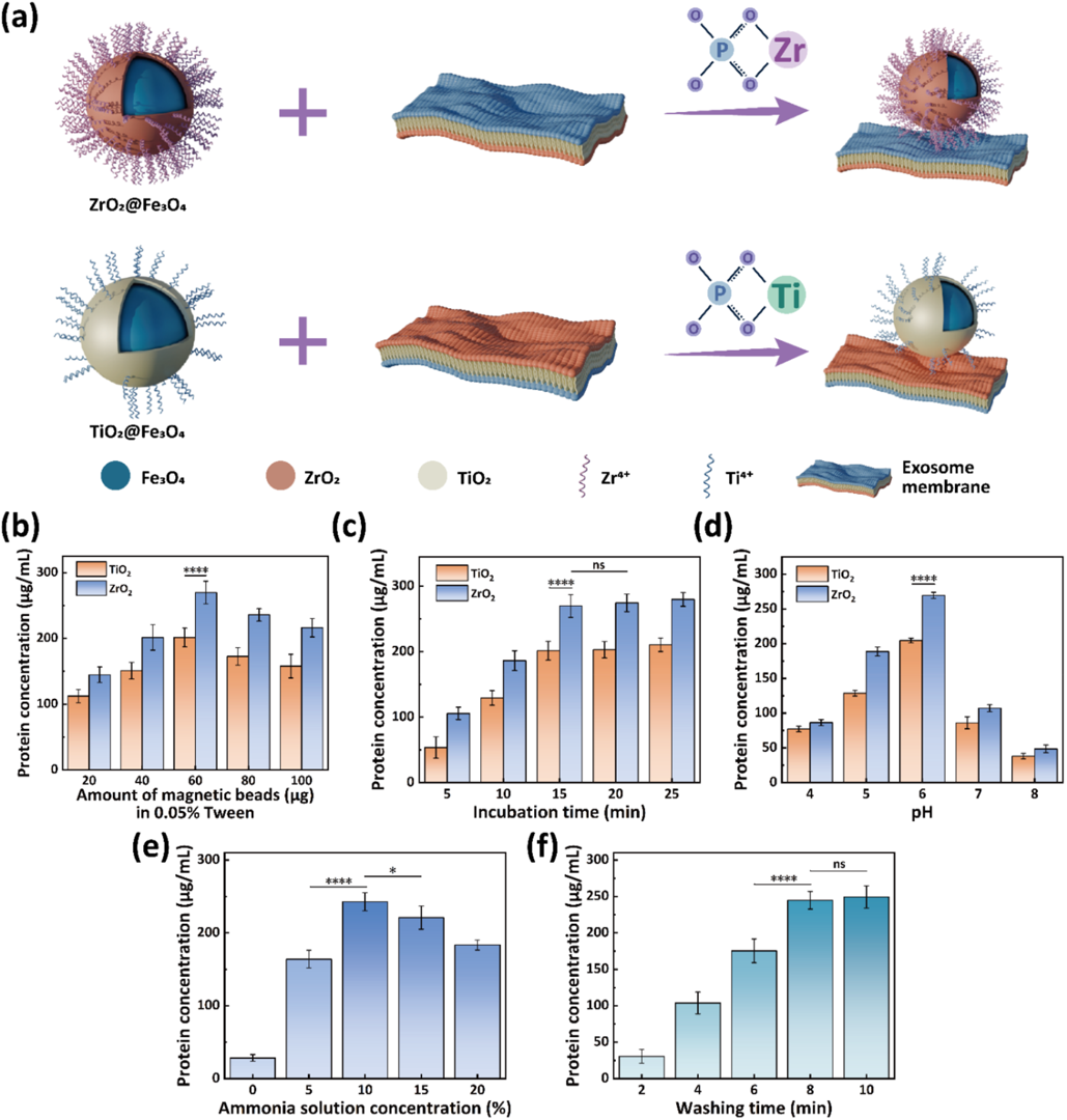 图2. (a) 使用 ZrO2@Fe3O4 和 TiO2@Fe3O4 磁珠进行 EV 富集的化学机制示意图;(b - d) 磁珠、孵育时间和溶液 pH 对 EV 富集效率的影响;(e, f) 氨浓度和洗脱时间对 EV 洗脱效率的影响。