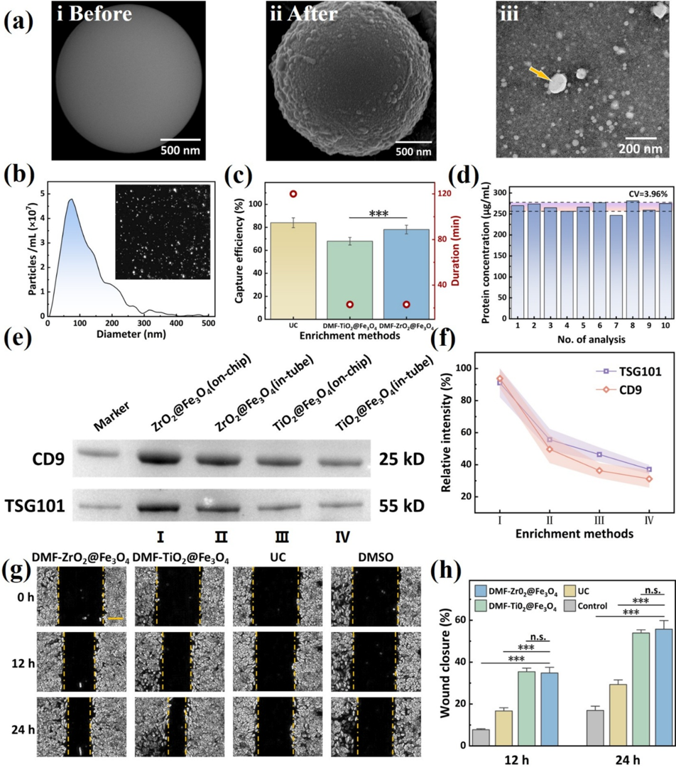图 3.(a) DMF 芯片上与 EV 样本孵育前(i)和孵育后(ii)ZrO2@Fe3O4 磁珠的 SEM 图像,以及洗脱囊泡的 TEM 图像(iii),箭头指向杯状 EV;(b) 分离 EV 的 NTA;(c) 使用不同方法进行 EV 富集的回收率和所需时间的比较;(d) 使用 DMF-ZrO2@Fe3O4 方法进行 EV 富集的重现性分析;(e, f) 使用 ZrO2@Fe3O4 或 TiO2@Fe3O4 在芯片上或管中分离的 EV 中 CD9 和 TSG10l 的 Western blot 分析;(g) 使用不同方法富集的 EV 添加到培养基中用于 HeLa 细胞划痕实验;(h) 通过计算 12 或 24 小时划痕宽度与 0 小时划痕宽度的比值来确定 HeLa 细胞的划痕愈合率。