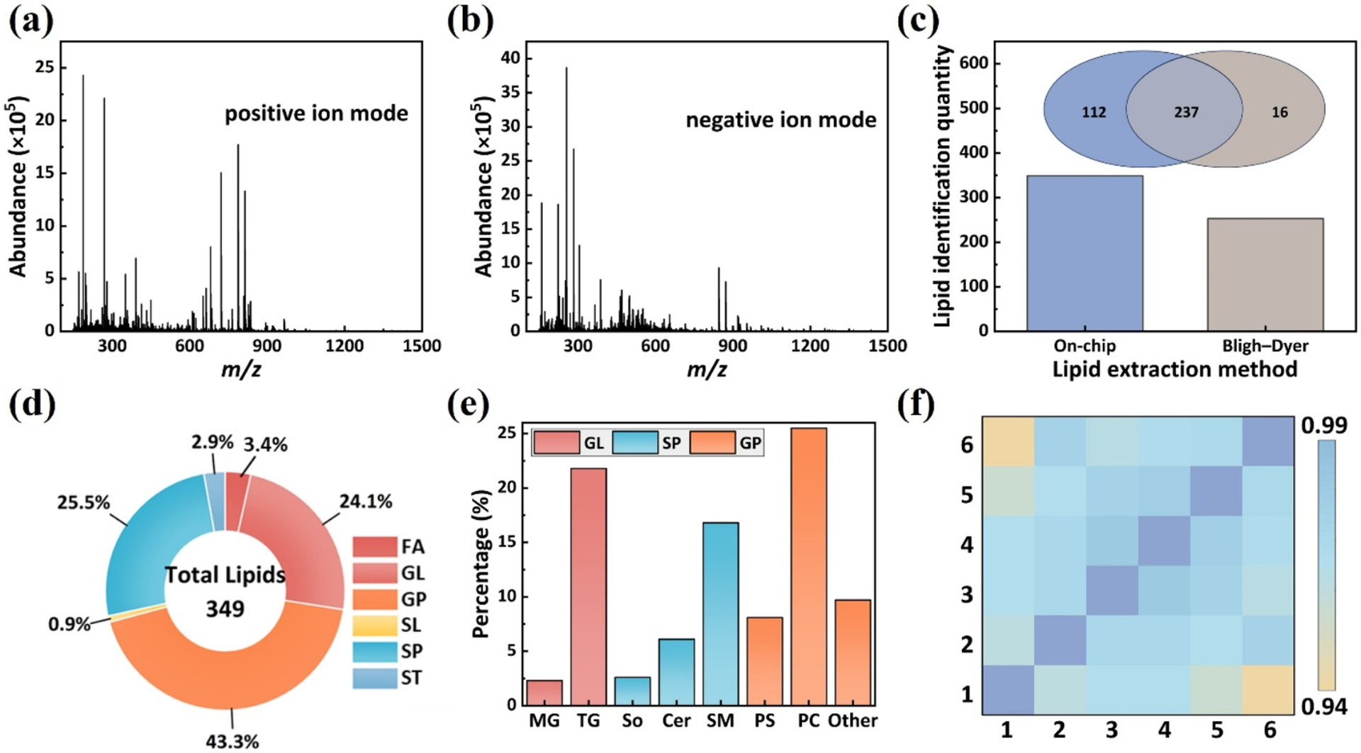 图 4.(a, b) 正离子和负离子模式下提取的外泌体脂质的质谱图;(c) 芯片提取与经典 Bligh−Dyer 方法之间脂质鉴定数量的比较;(d) 从 HeLa 细胞富集的 EV 中鉴定出的脂质的分类;(e) 从 HeLa 细胞富集的 EV 中鉴定出的脂质的亚分类;(f) 重复实验之间脂质丰度的相关性分析。